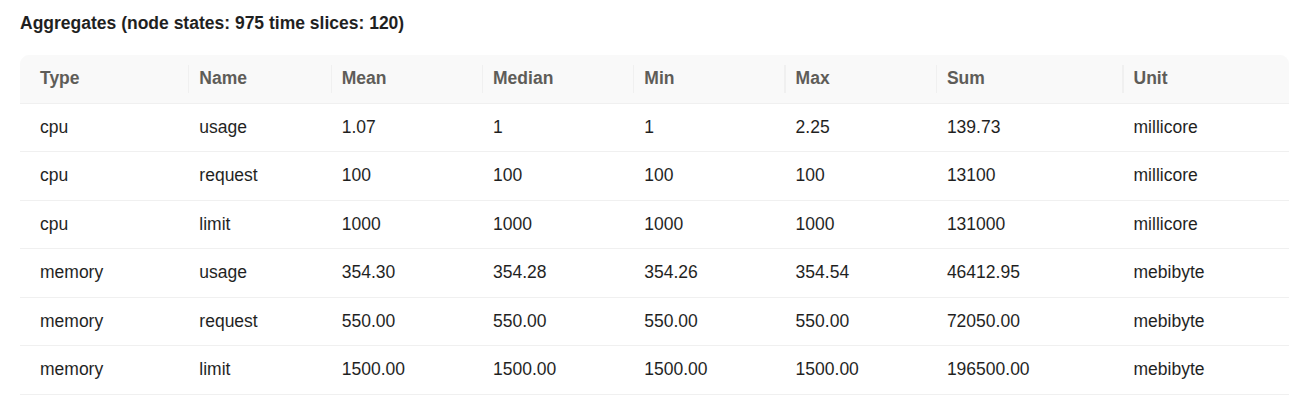 Runtime Node Usage details This aggregate table summarizes pod-level resource usage over 120 time slices with high stability and low variance.