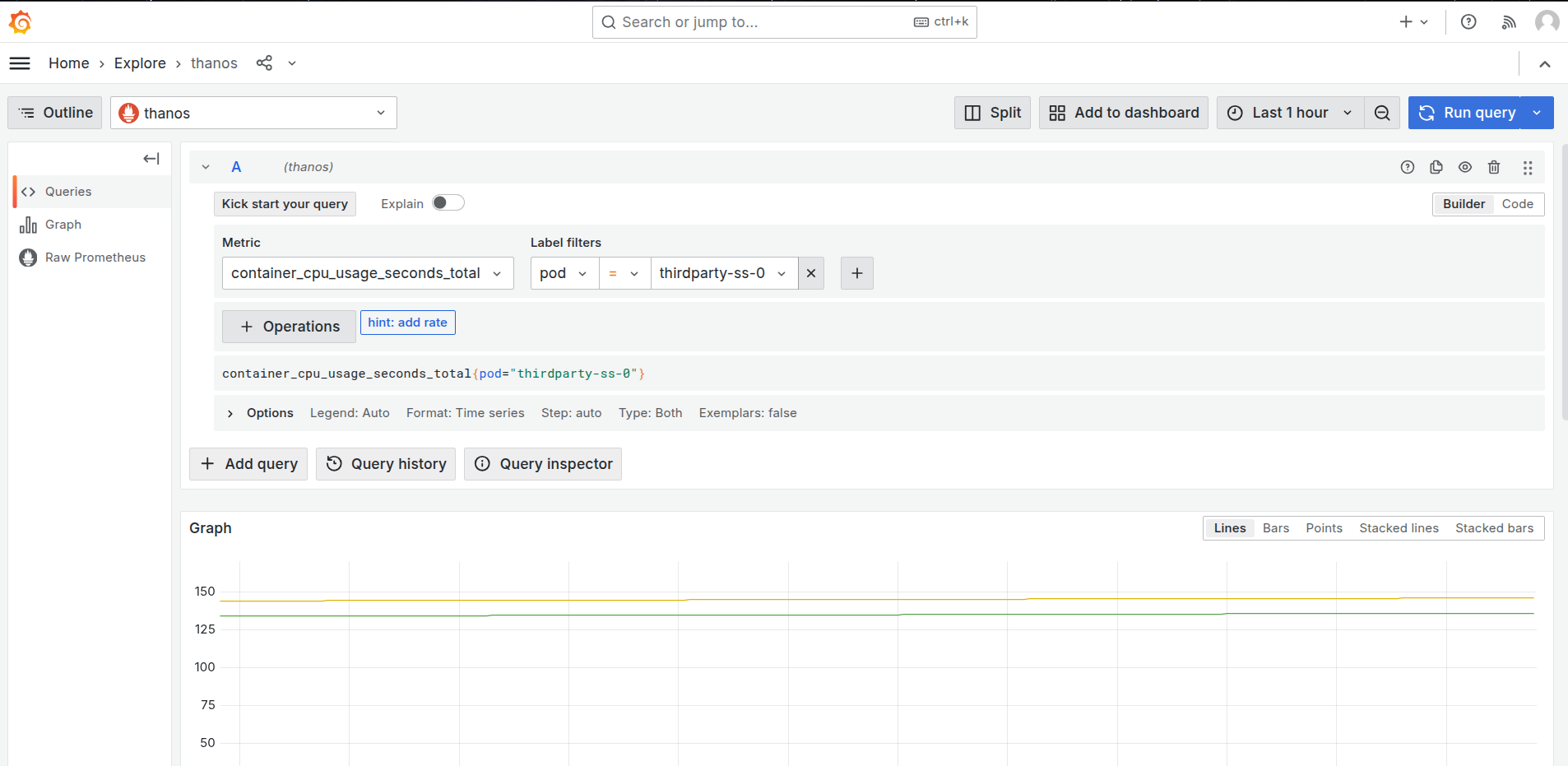 thirdparty. Its cumulative CPU usage reaches approximately 135.90 seconds, showing moderate and stable resource consumption over the observed time window. - Yellow Line: This denotes another container (init container) within the same pod. It shows slightly higher CPU consumption (~145.97 seconds), which suggests either a more active or prolonged process during the same period.