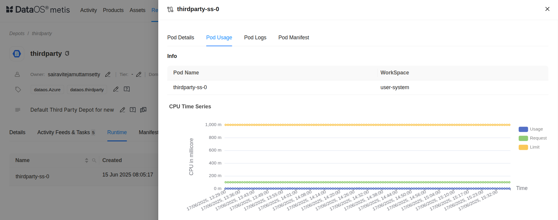 When a Depot Resource is created, a corresponding pod is automatically provisioned in the backend. You can monitor the CPU and memory usage of this pod directly through the Operations app.