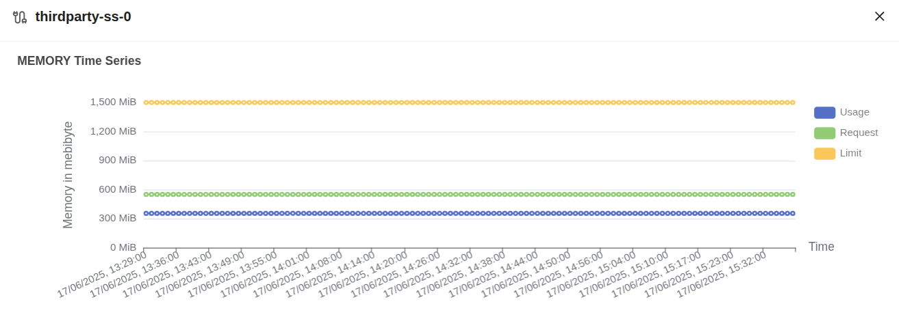 thirdparty-ss-0over a continuous time range.- Blue Line (Usage): Represents the actual CPU consumption by the pod. The values remain consistently below the green request line, indicating efficient and stable CPU usage without any spikes.
