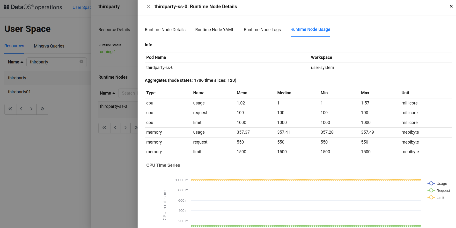 Click on the pod name for which you want to monitor the CPU and memory usage, and navigate to the ‘Runtime Node Usage’ section.
