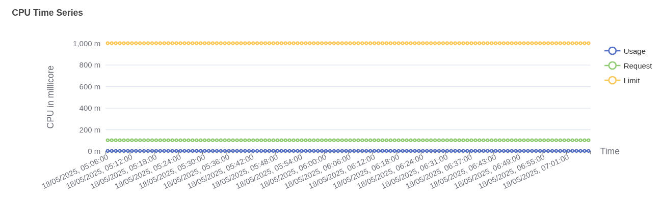 - Usage: The pod’s average CPU consumption was around 1.07 millicores, with a maximum peak of 2.25 millicores, far below its configured capacity.
