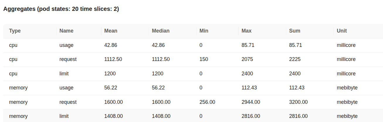 - Unit: Measurement unit (millicore for CPU mebibyte for memory).