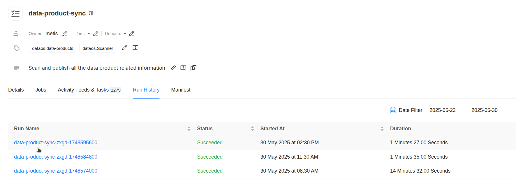 data-product-sync: This is the base name of the Workflow. It signifies that the execution relates to the synchronization of Data Product metadata typically involving scanning the Data Product information into the Metis catalog.zagd: This segment helps in disambiguating multiple concurrent executions within the same logical job group.<epoch_timestamp>: This is a Unix epoch timestamp (in seconds) uniquely identifying the specific instance of the pipeline run. For example1748569600converts to30 May 2025 at 02:30 PM UTCmatching the “Started At” column. This timestamp ensures uniqueness and traceability across executions allowing for precise correlation with system logs events and downstream data updates.