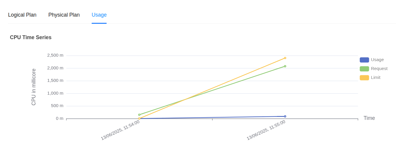 This section explains how to monitor the overall CPU and memory usage of a Workflow in DataOS using the Metis UI. Since each Workflow in DataOS runs as a Kubernetes pod this information helps users evaluate runtime efficiency validate resource configurations and troubleshoot performance issues such as throttling or memory exhaustion.