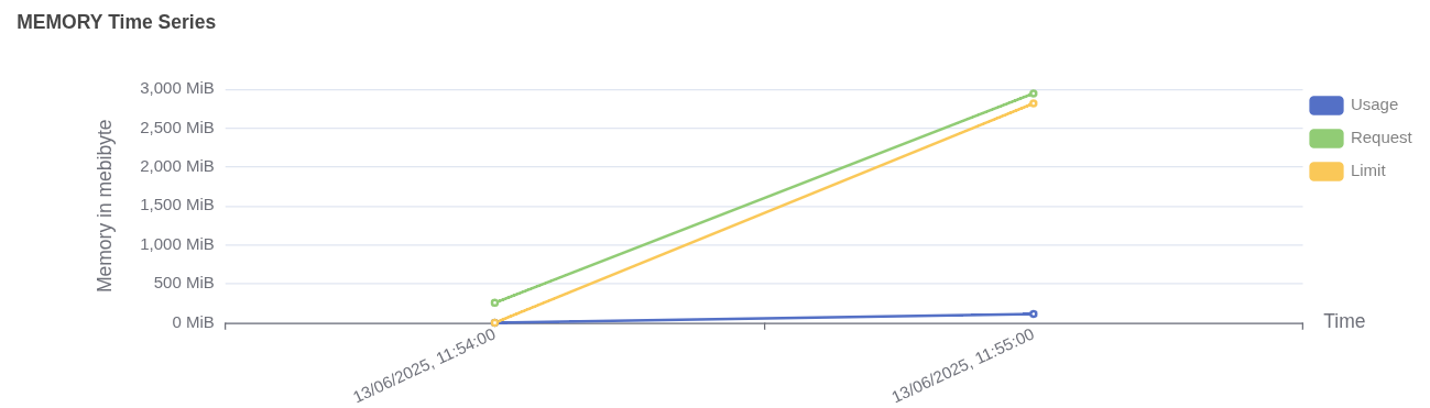 - Limit (yellow line) is around 3000 MiB the upper cap for memory consumption.