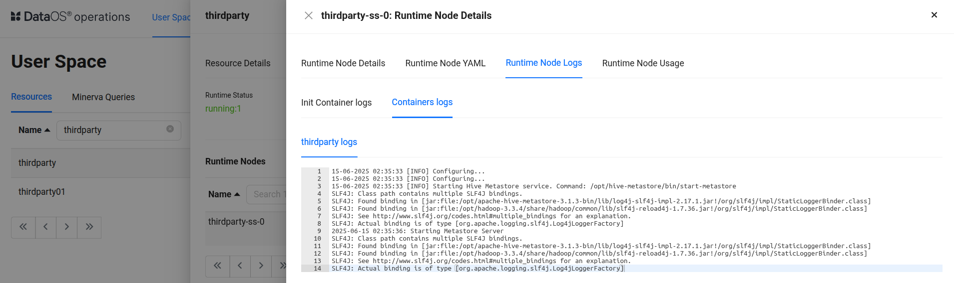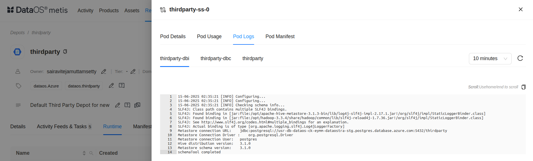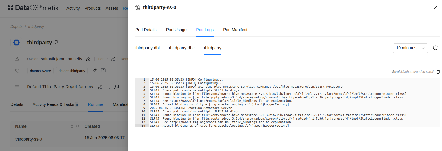 dataos-ctl log -t depot -n thirdparty INFO[0000] π log(public)... INFO[0002] π log(public)...complete NODE NAME β CONTAINER NAME β ERROR βββββββββββββββββββΌβββββββββββββββββΌββββββββ thirdparty-ss-0 β thirdparty β # ^ main container -------------------LOGS------------------- 15-06-2025 02:35:33 [INFO] Configuring... 15-06-2025 02:35:33 [INFO] Configuring... 15-06-2025 02:35:33 [INFO] Starting Hive Metastore service. Command: /opt/hive-metastore/bin/start-metastore SLF4J: Class path contains multiple SLF4J bindings. SLF4J: Found binding in [jar:file:/opt/apache-hive-metastore-3.1.3-bin/lib/log4j-slf4j-impl-2.17.1.jar!/org/slf4j/impl/StaticLoggerBinder.class] SLF4J: Found binding in [jar:file:/opt/hadoop-3.3.4/share/hadoop/common/lib/slf4j-reload4j-1.7.36.jar!/org/slf4j/impl/StaticLoggerBinder.class] SLF4J: See http://www.slf4j.org/codes.html#multiple_bindings for an explanation. SLF4J: Actual binding is of type [org.apache.logging.slf4j.Log4jLoggerFactory] 2025-06-15 02:35:36: Starting Metastore Server SLF4J: Class path contains multiple SLF4J bindings. SLF4J: Found binding in [jar:file:/opt/apache-hive-metastore-3.1.3-bin/lib/log4j-slf4j-impl-2.17.1.jar!/org/slf4j/impl/StaticLoggerBinder.class] SLF4J: Found binding in [jar:file:/opt/hadoop-3.3.4/share/hadoop/common/lib/slf4j-reload4j-1.7.36.jar!/org/slf4j/impl/StaticLoggerBinder.class] SLF4J: See http://www.slf4j.org/codes.html#multiple_bindings for an explanation. SLF4J: Actual binding is of type [org.apache.logging.slf4j.Log4jLoggerFactory]This log confirms that the