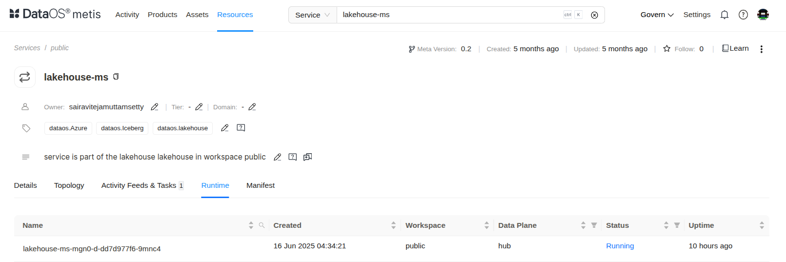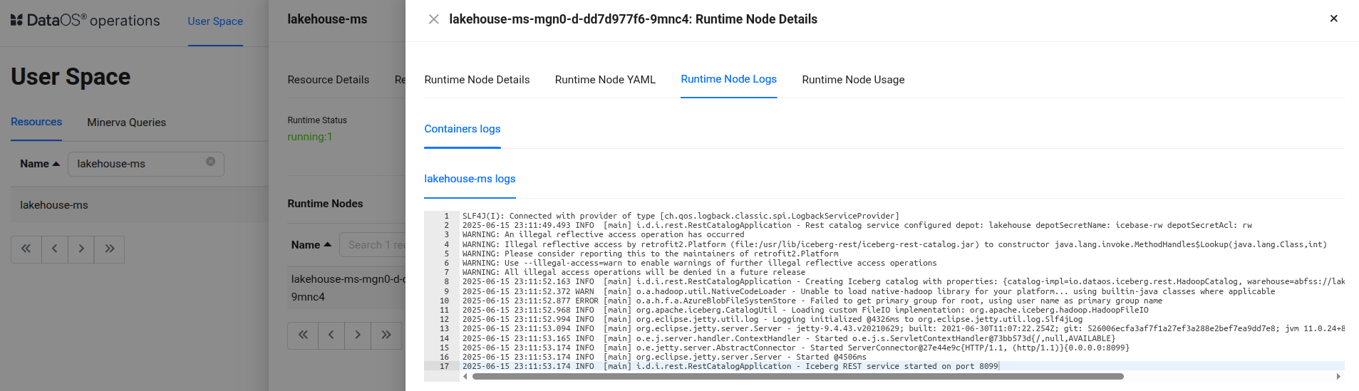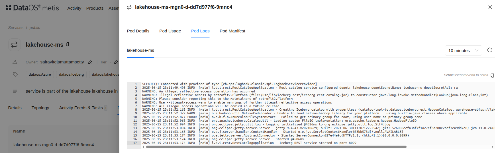 dataos-ctl log -t service -w public -n lakehouse-ms INFO[0000] π log(public)... INFO[0001] π log(public)...complete NODE NAME β CONTAINER NAME β ERROR βββββββββββββββββββββββββββββββββββββββΌβββββββββββββββββΌββββββββ lakehouse-ms-mgn0-d-dd7d977f6-9mnc4 β lakehouse-ms β # ^ pod name -------------------LOGS------------------- SLF4J(I): Connected with provider of type [ch.qos.logback.classic.spi.LogbackServiceProvider] 2025-06-15 23:11:49.493 INFO [main] i.d.i.rest.RestCatalogApplication - Rest catalog service configured depot: lakehouse depotSecretName: icebase-rw depotSecretAcl: rw WARNING: An illegal reflective access operation has occurred WARNING: Illegal reflective access by retrofit2.Platform (file:/usr/lib/iceberg-rest/iceberg-rest-catalog.jar) to constructor java.lang.invoke.MethodHandles$Lookup(java.lang.Class,int) WARNING: Please consider reporting this to the maintainers of retrofit2.Platform WARNING: Use --illegal-access=warn to enable warnings of further illegal reflective access operations WARNING: All illegal access operations will be denied in a future release 2025-06-15 23:11:52.163 INFO [main] i.d.i.rest.RestCatalogApplication - Creating Iceberg catalog with properties: {catalog-impl=io.dataos.iceberg.rest.HadoopCatalog, warehouse=abfss://lake001@dlake0bnoss0dsck0stg.dfs.core.windows.net/lakehouse01} 2025-06-15 23:11:52.372 WARN [main] o.a.hadoop.util.NativeCodeLoader - Unable to load native-hadoop library for your platform... using builtin-java classes where applicable 2025-06-15 23:11:52.877 ERROR [main] o.a.h.f.a.AzureBlobFileSystemStore - Failed to get primary group for root, using user name as primary group name 2025-06-15 23:11:52.968 INFO [main] org.apache.iceberg.CatalogUtil - Loading custom FileIO implementation: org.apache.iceberg.hadoop.HadoopFileIO 2025-06-15 23:11:52.994 INFO [main] org.eclipse.jetty.util.log - Logging initialized @4326ms to org.eclipse.jetty.util.log.Slf4jLog 2025-06-15 23:11:53.094 INFO [main] org.eclipse.jetty.server.Server - jetty-9.4.43.v20210629; built: 2021-06-30T11:07:22.254Z; git: 526006ecfa3af7f1a27ef3a288e2bef7ea9dd7e8; jvm 11.0.24+8-post-Debian-2deb11u1 2025-06-15 23:11:53.165 INFO [main] o.e.j.server.handler.ContextHandler - Started o.e.j.s.ServletContextHandler@73bb573d{/,null,AVAILABLE} 2025-06-15 23:11:53.174 INFO [main] o.e.jetty.server.AbstractConnector - Started ServerConnector@27e44e9c{HTTP/1.1, (http/1.1)}{0.0.0.0:8099} 2025-06-15 23:11:53.174 INFO [main] org.eclipse.jetty.server.Server - Started @4506ms 2025-06-15 23:11:53.174 INFO [main] i.d.i.rest.RestCatalogApplication - Iceberg REST service started on port 8099The logs in the above example show that: