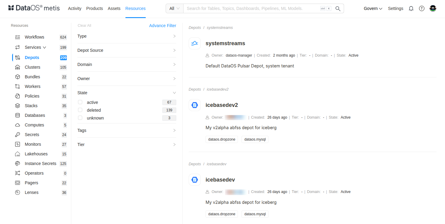 Resources → Depotsto check the status of any Depot within the environment. Additionally, users can quickly find a specific Depot by searching for its name in the Metis UI search bar.