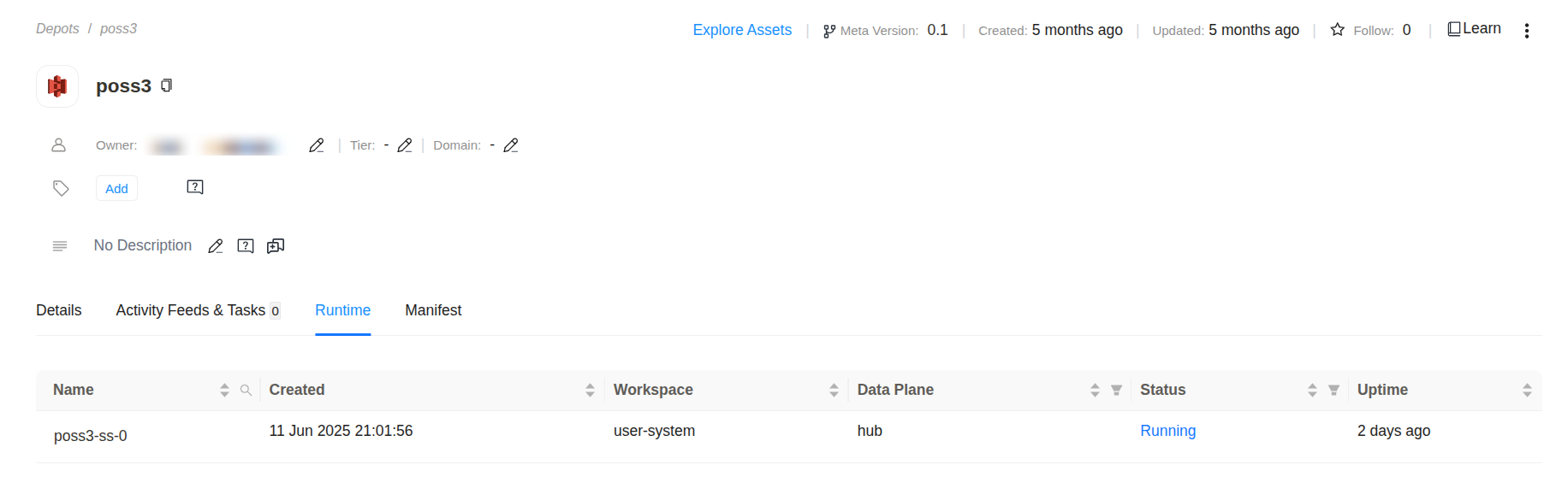 Depot runtime in Metis The Runtime section shows the live execution environment of a Resource, in this case, a Depot. It reflects details like when the runtime was created, which workspace and data plane it’s using, its current status (e.g.,