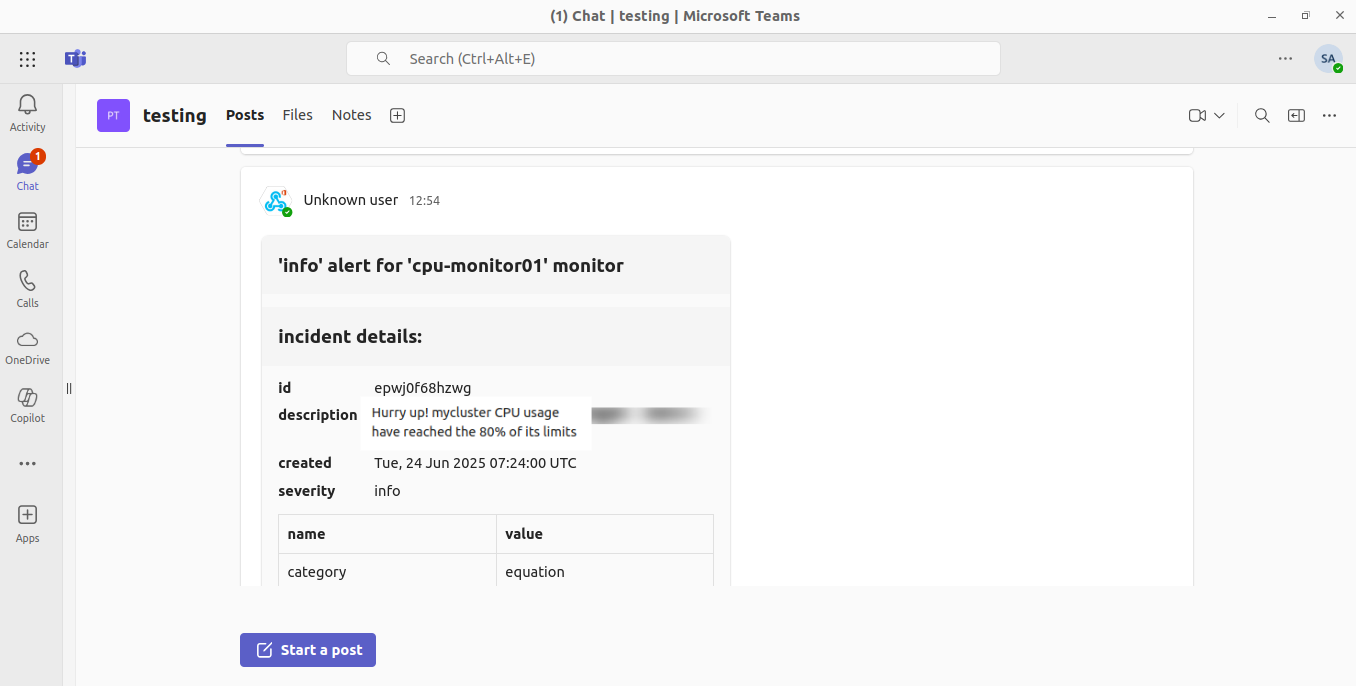 - In this scenario, as soon as the Cluster’s CPU usage hit the threshold for the configured duration, the Monitor created an incident, which the Pager caught. An operator saw a Teams notification (e.g., “Alert: cpu-monitor01 triggered with severity