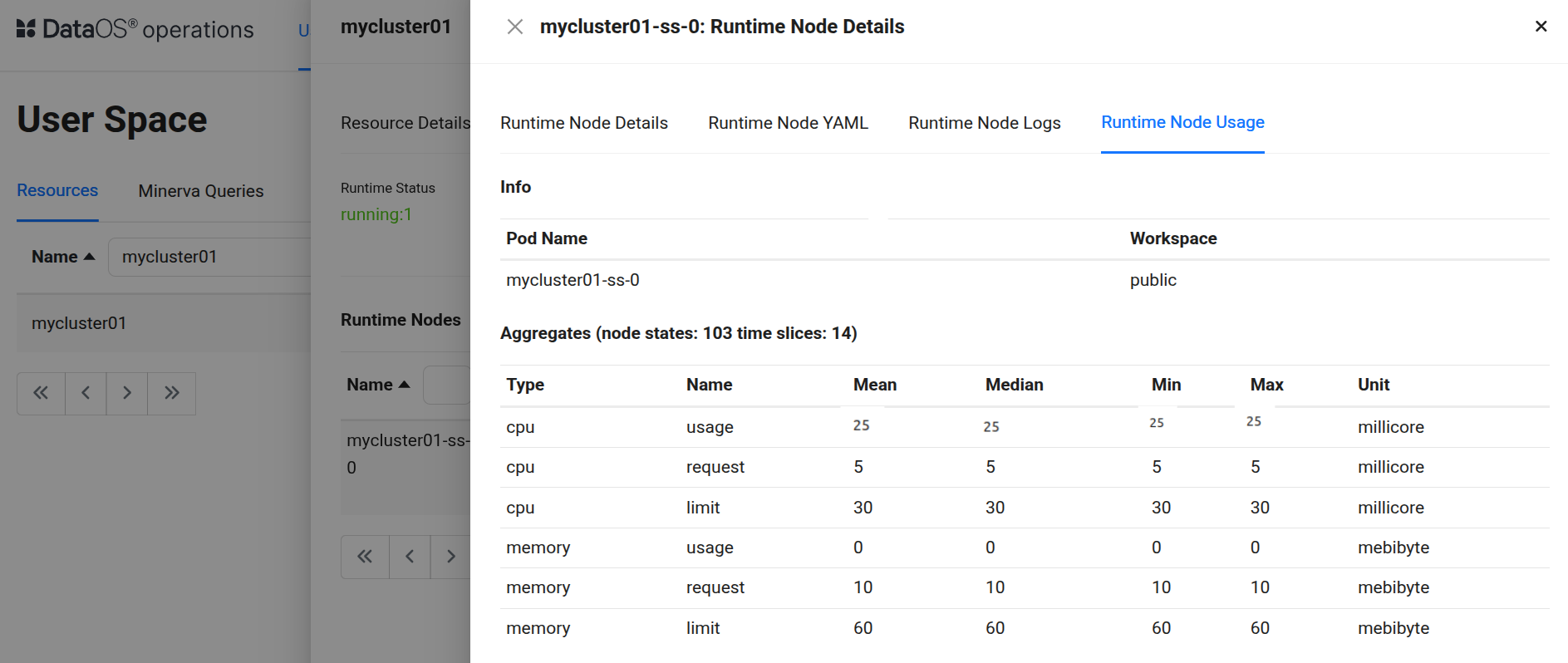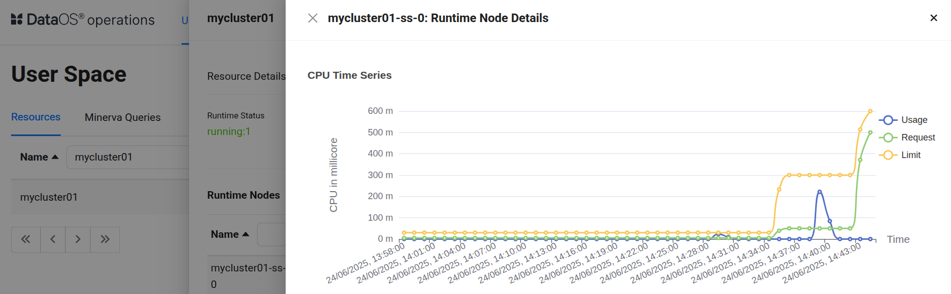 This command pushes the new configuration to DataOS, updating the Cluster resource with the higher CPU limit (in Kubernetes terms, this would update the pod’s resource limits). The platform then provisioned the additional CPU for the Cluster. Once this step is complete, the Cluster resource gets updated with the new CPU allocation as shown below.